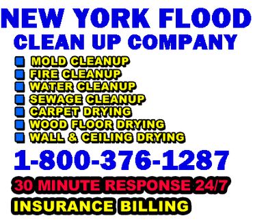 NEW YORK FLOOD CLEAN UP COMPANY is a 24/7 emergency disaster clean up and restoration company. We offer 30 Minute Response for flood water clean up, sewage water clean up, fire clean up, smoke clean up, mold clean up, mud cleanup, hoarder clean up, gross filth cleanup and animal feces clean up service. All technicians are certified for flood water damage cleaning, sewage damage cleaning, fire damage cleaning & mold damage cleaning service. We bill your insurance company directly for all disaster damage restoration.