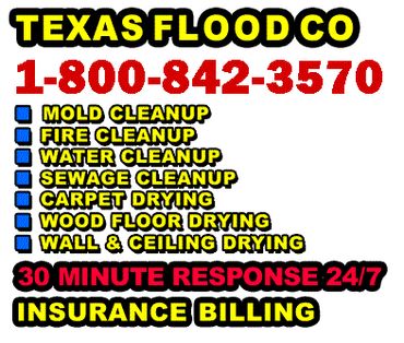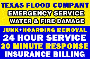 TEXAS FLOOD COMPANY is a 24/7 emergency disaster clean up and water damage restoration company. We offer 30 Minute Response for flood water clean up, sewage water clean up, fire clean up, smoke clean up, mold clean up, mud cleanup, hoarder clean up, gross filth cleanup, animal feces clean up and junk removal service. All technicians are certified for flood water damage cleaning, sewage damage cleaning, fire damage cleaning & mold damage cleaning service. TEXAS FLOOD COMPANY will bill your insurance company directly for all disaster damage restoration.